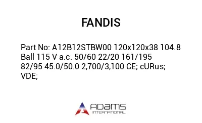 Description: FANDIS - A12B12STBW00 120X120X38 104.8 BALL 115 V A.C. 50/60 22/20 161/195 82/95 45.0/50.0 2,700/3,100 CE; CURUS; VDE;